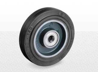 Roată cu suprafața de rulare din cauciuc „Sigma elastic” cu duritate de 70+/-3 shore A, cu jantă din fontă.