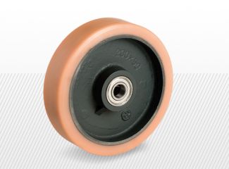 Roată cu suprafața de rulare din Vulkollan cu duritate de 93+/-2 shore A cu jantă din fontă.